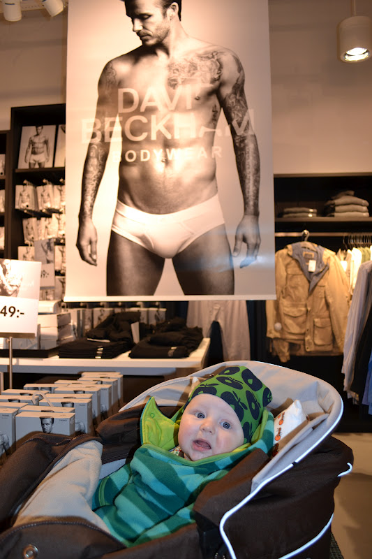 Idag sken solen ljuvligt och det luktade vår i luften. Så medan pappan i hemmet målade väggar passade mor och son att ta sig ut på en liten promenix i det fina vädret. Som ni kan se stannade vi en sväng på HM för att kolla på lite kläder hehe... Harry som tillslut blev lite smått less över att sin kära mor stannade lite väl länge på herravdelningen gav ifrån sig några klagorop då han tillslut fick sin vilja igenom och rullades ut i den skinande solen igen. Tur då att Harrys egna små glajjer fanns på plats så han kunde spana loss på allt som rörde sig runtomkring utan att bli störd utav solskenet som så härligt strålade.